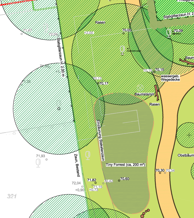 Schaut man sich die Waldflächen im Vergleich zum bestehenden Baumbestand an, dann überspannen bereits die Kronen von zwei bestehenden Bäumen eine der kleinen Tiny-Forest-Flächen (siehe Ausschnitt Planzeichnung Stadt Bochum). Geht man von der Größe der bestehenden Bäume aus, fänden auf den Tiny-Forest-Flächen 20-25 ausgewachsene Bäume Platz.